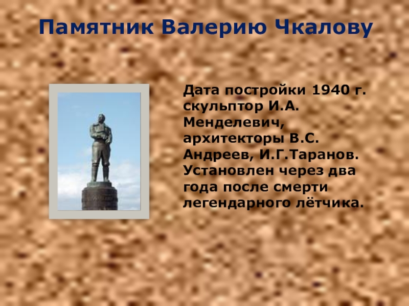 Памятник Валерию ЧкаловуДата постройки 1940 г. скульптор И.А.Менделевич, архитекторы В.С.Андреев, И.Г.Таранов.Установлен через два года после смерти легендарного