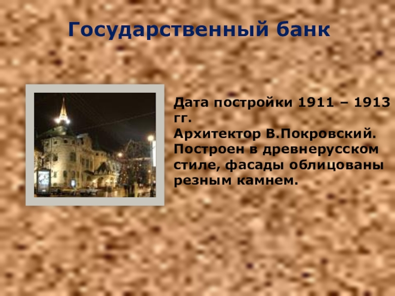 Государственный банкДата постройки 1911 – 1913 гг.Архитектор В.Покровский.Построен в древнерусском стиле, фасады облицованы резным камнем.