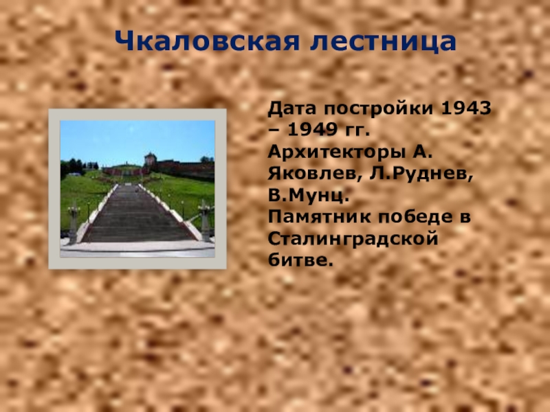 Чкаловская лестницаДата постройки 1943 – 1949 гг.Архитекторы А.Яковлев, Л.Руднев, В.Мунц.Памятник победе в Сталинградской битве.