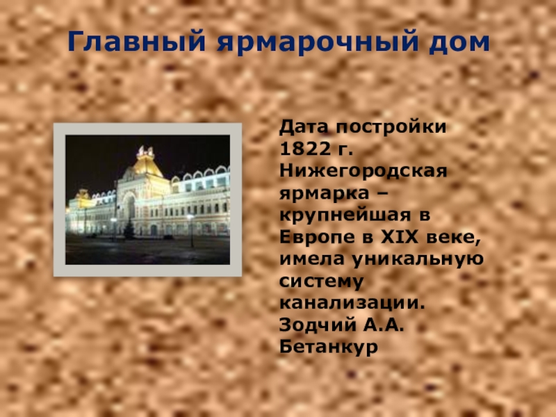 Главный ярмарочный домДата постройки 1822 г.Нижегородская ярмарка – крупнейшая в Европе в XIX веке, имела уникальную систему