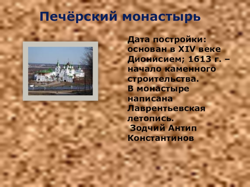 Печёрский монастырьДата постройки: основан в XIV веке Дионисием; 1613 г. – начало каменного строительства.В монастыре написана Лаврентьевская