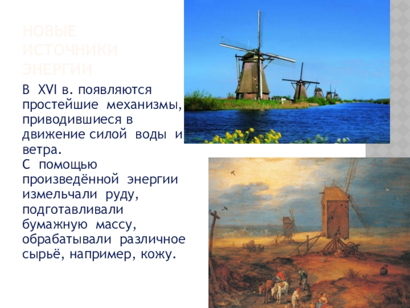 НОВЫЕ ИСТОЧНИКИ ЭНЕРГИИВ XVI в. появляются простейшие механизмы, приводившиеся в движение силой воды и ветра. С помощью произведённой энергии измельчали руду, подготавливали бумажную массу, обрабатывали различное сырьё, например, кожу.