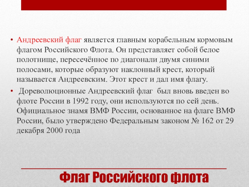 Андреевский флаг является главным корабельным кормовым флагом Российского Флота.