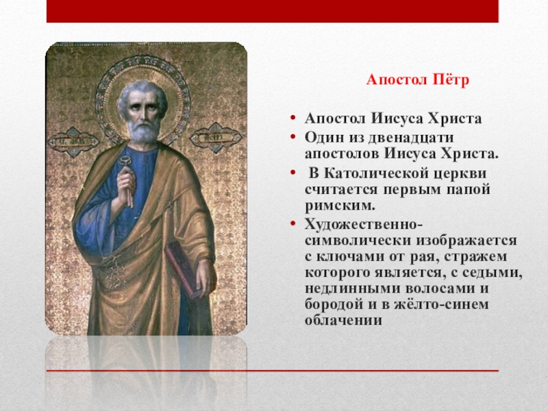 Художественно-символически изображается с ключами от рая, стражем которого является, с седыми, недлинными волосами и бородой и в жёлто-синем облачении