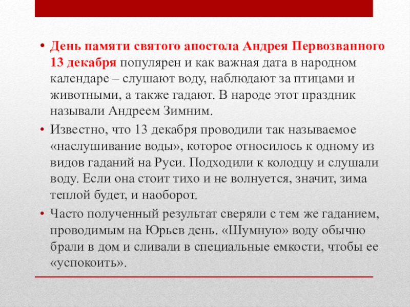важная дата в народном календаре – слушают воду, наблюдают за птицами и животными, а также гадают. В народе этот праздник называли Андреем Зимним.