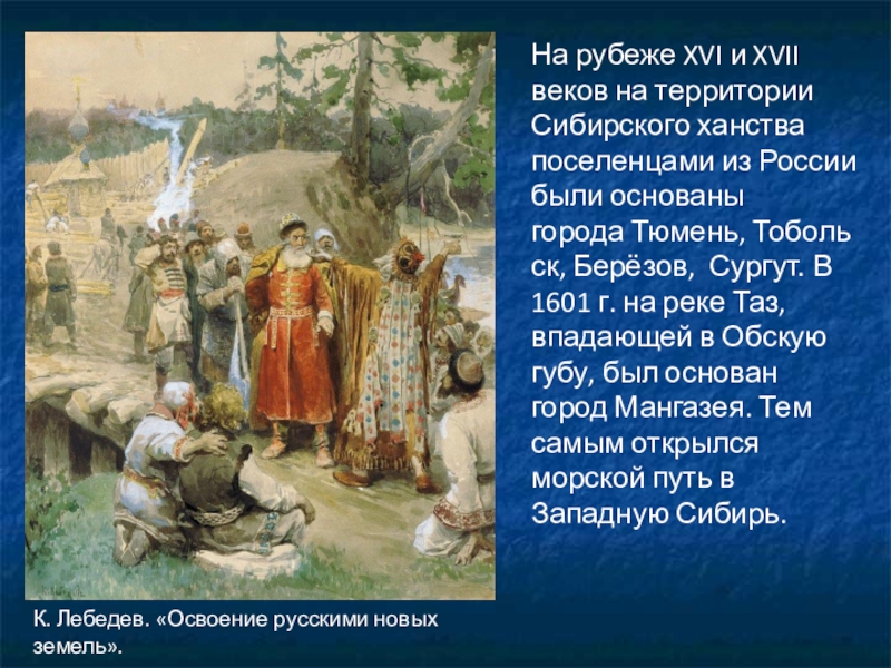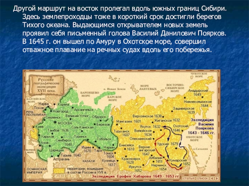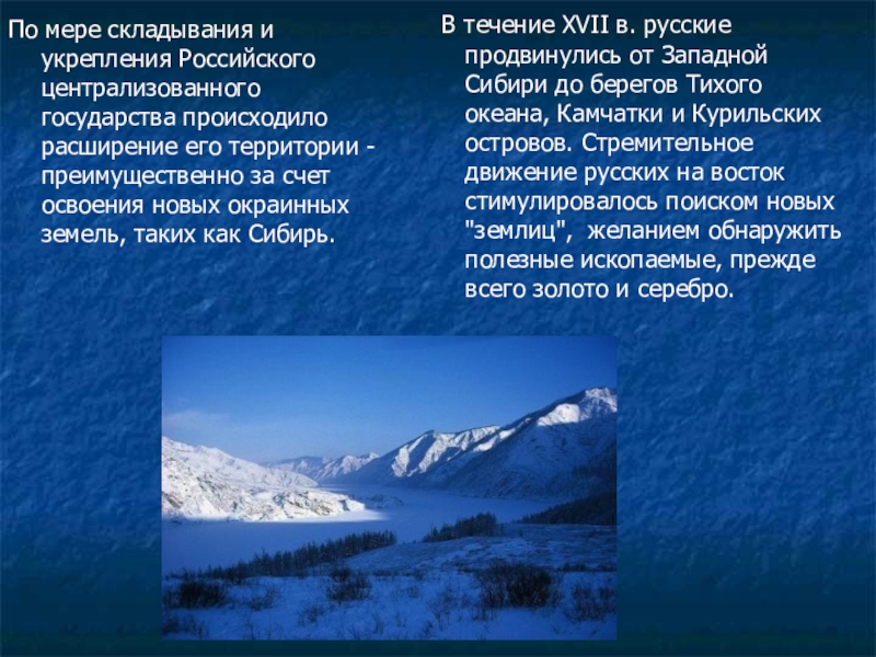 В течение XVII в. русские продвинулись от Западной Сибири до берегов Тихого океана, Камчатки и Курильских островов. Стремительное движение русских на восток стимулировалось поиском новых "землиц", желанием обнаружить полезные ископаемые, прежде всего золото и серебро.