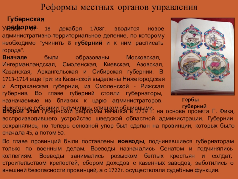Во главе провинций были поставлены воеводы, подчинявшиеся губернаторам только по военным делам. Воеводы назначались Сенатом и подчинялись коллегиям. Воеводы занимались розыском беглых крестьян и солдат, строительством крепостей, сбором доходов с казенных заводов, заботились о внешней безопасности провинций, а с 1722г. осуществляли судебные функции.