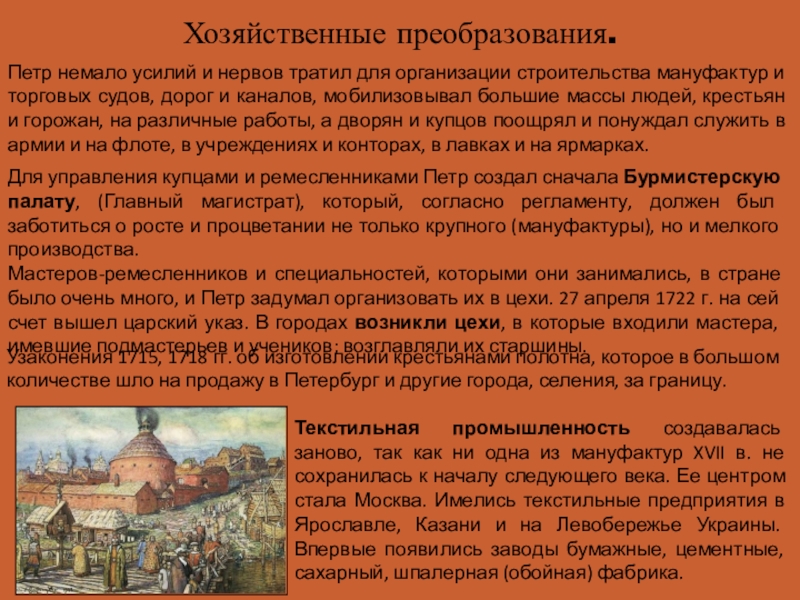 Петр немало усилий и нервов тратил для организации строительства мануфактур и торговых судов, дорог и каналов, мобилизовывал большие массы людей, крестьян и горожан, на различные работы, а дворян и купцов поощрял и понуждал служить в армии и на флоте, в учреждениях и конторах, в лавках и на ярмарках.