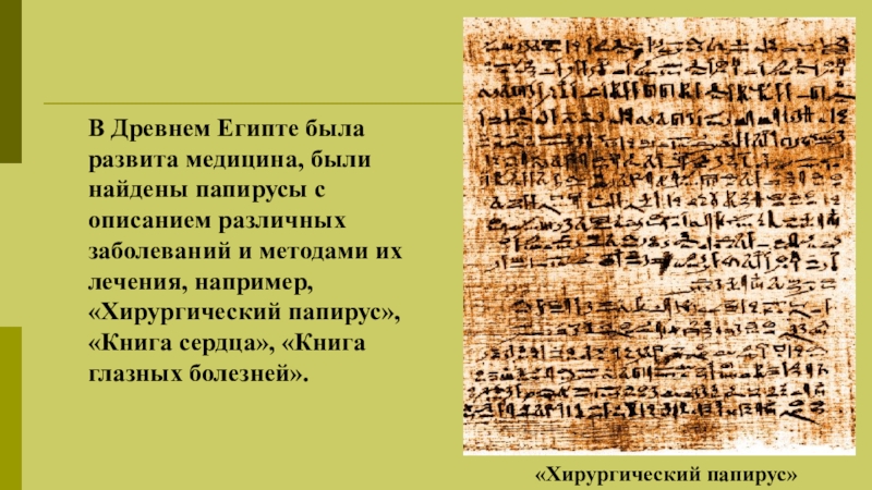 различных заболеваний и методами их лечения, например, «Хирургический папирус», «Книга сердца», «Книга глазных болезней».