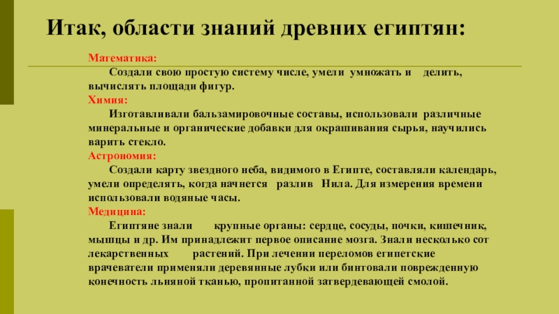 Слайд 29Итак, области знаний древних египтян: