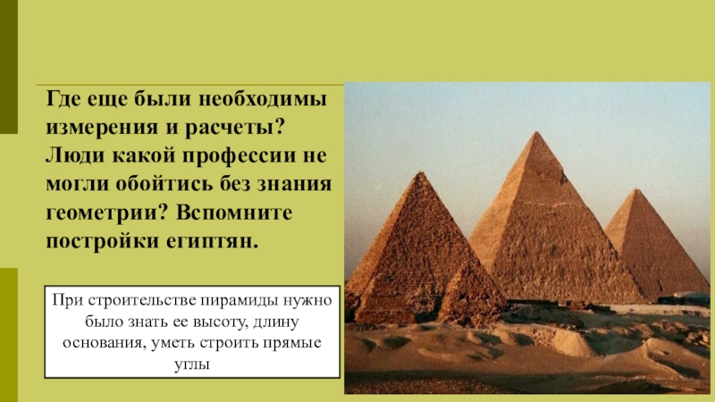 При строительстве пирамиды нужно было знать ее высоту, длину основания, уметь строить прямые углы