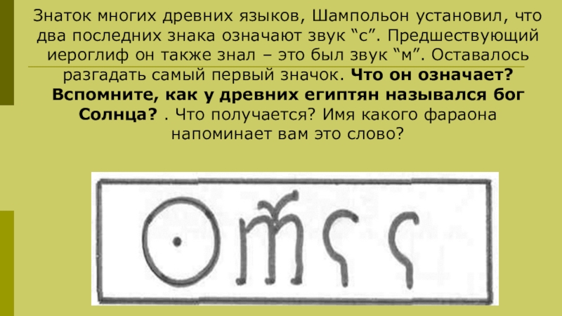 звук “с”. Предшествующий иероглиф он также знал – это был звук “м”. Оставалось разгадать самый первый значок. Что он означает? Вспомните, как у древних египтян назывался бог Солнца? . Что получается? Имя какого фараона напоминает вам это слово?