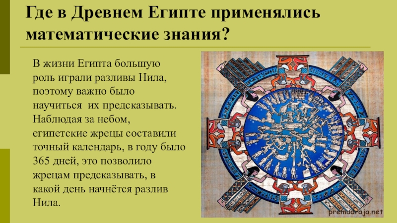 играли разливы Нила, поэтому важно было научиться их предсказывать. Наблюдая за небом, египетские жрецы составили точный календарь, в году было 365 дней, это позволило жрецам предсказывать, в какой день начнётся разлив Нила.