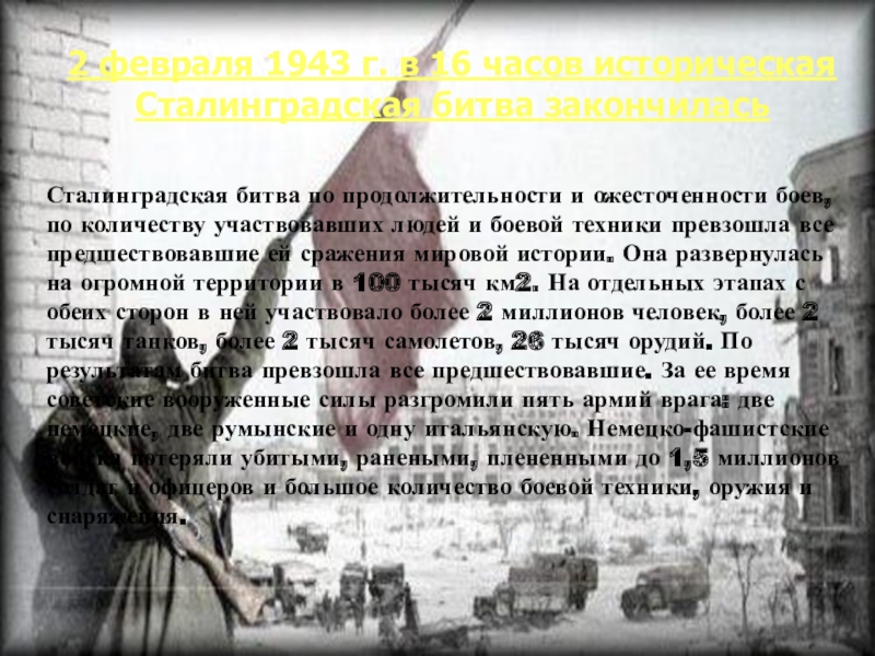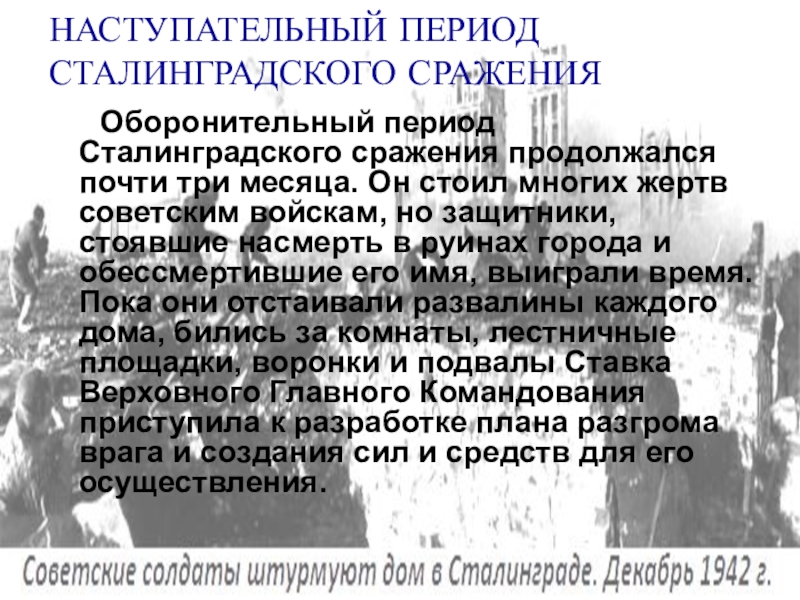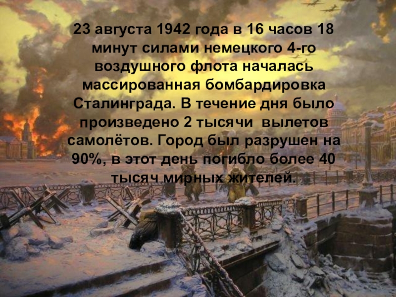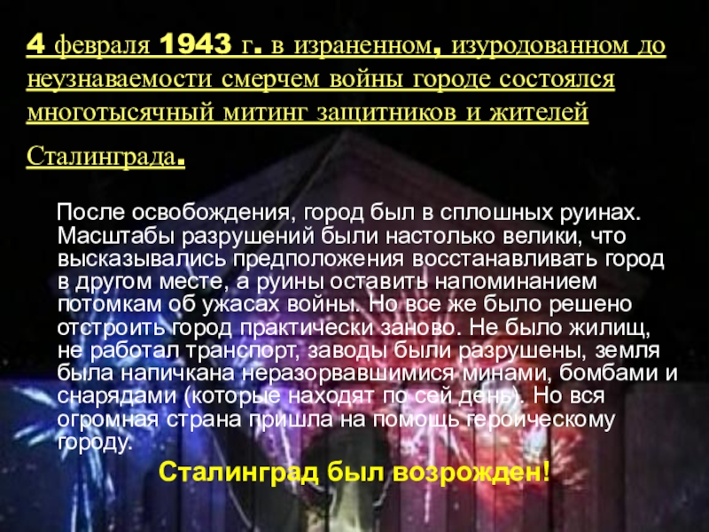 После освобождения, город был в сплошных руинах. Масштабы разрушений были настолько велики, что высказывались предположения восстанавливать город в другом месте, а руины оставить напоминанием потомкам об ужасах войны. Но все же было решено отстроить город практически заново. Не было жилищ, не работал транспорт, заводы были разрушены, земля была напичкана неразорвавшимися минами, бомбами и снарядами (которые находят по сей день). Но вся огромная страна пришла на помощь героическому городу.
