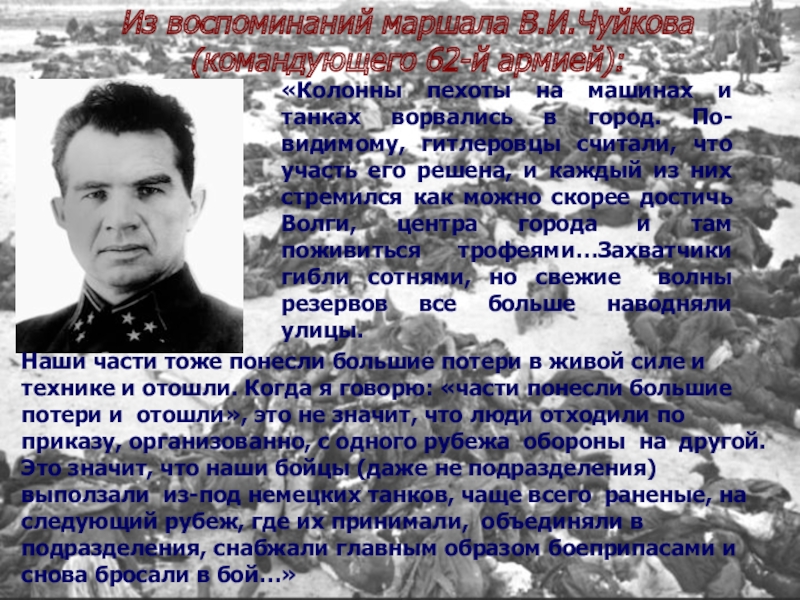 Наши части тоже понесли большие потери в живой силе и технике и отошли. Когда я говорю: «части понесли большие потери и отошли», это не значит, что люди отходили по приказу, организованно, с одного рубежа обороны на другой. Это значит, что наши бойцы (даже не подразделения) выползали из-под немецких танков, чаще всего раненые, на следующий рубеж, где их принимали, объединяли в подразделения, снабжали главным образом боеприпасами и снова бросали в бой…»