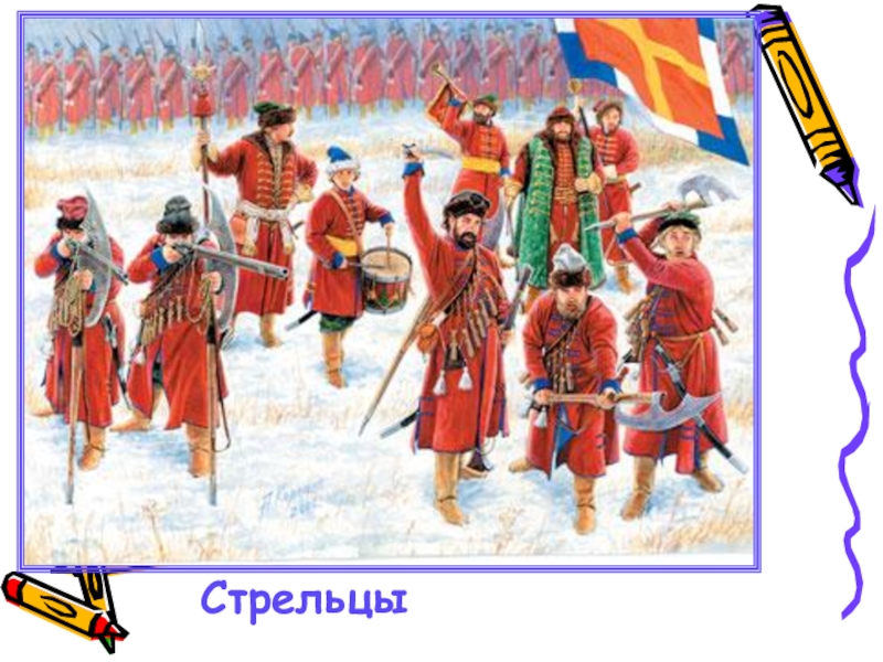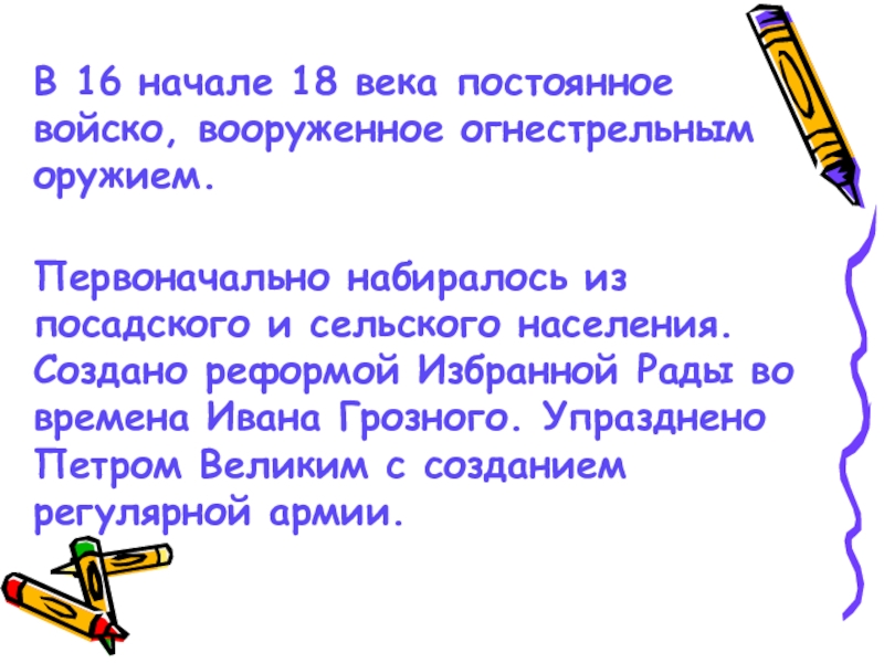 В 16 начале 18 века постоянное войско, вооруженное огнестрельным оружием.Первоначально набиралось из посадского и сельского населения.Создано реформой