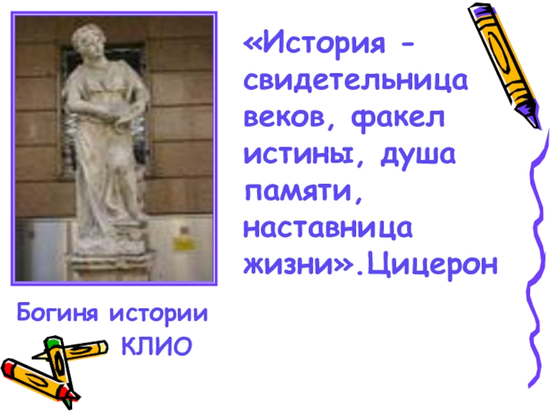 Богиня истории«История -свидетельница веков, факел истины, душа памяти, наставница жизни».ЦицеронКЛИО
