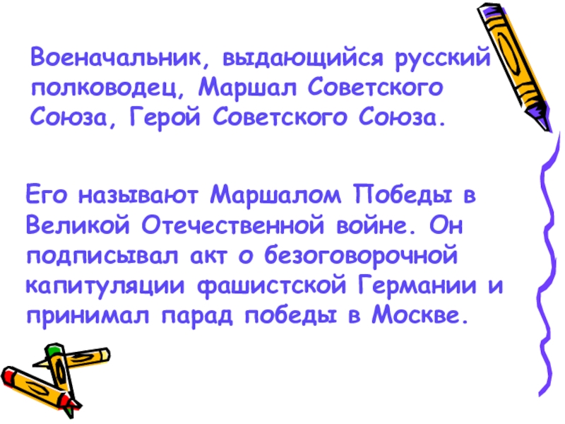 Слайд 9Военачальник, выдающийся русский полководец, Маршал Советского Союза, Герой Советского Союза.