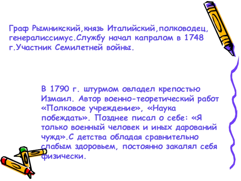 Слайд 5Граф Рымникский,князь Италийский,полководец,генералиссимус.Службу начал капралом в 1748 г.Участник Семилетней войны.