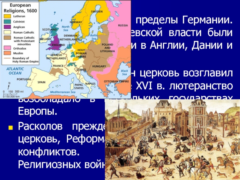 В каждой из этих стран церковь возглавил её монарх. К середине XVI в. лютеранство возобладало в нескольких государствах Европы.