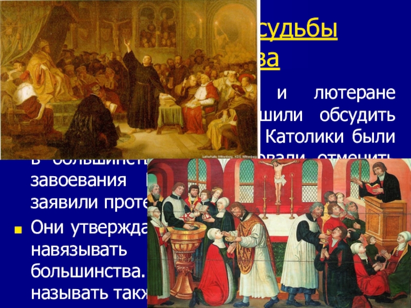 Лютера) решили обсудить религиозные разногласия. Католики были в большинстве и потребовали отменить завоевания Реформации, но лютеране заявили протест.