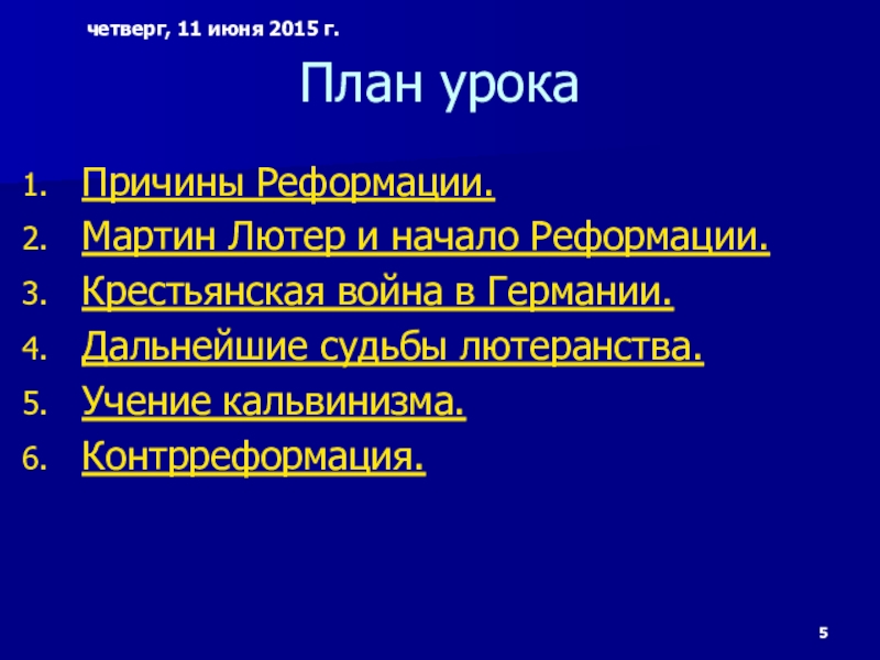 Цель урока: учащиеся узнают, что причинами Реформации явились процессы, связанные с разрушением традиционного европейского общества: изменения в сознании людей, постепенное превращение европейского человека в индивидуальность и кризис в связи с этим католической церкви.