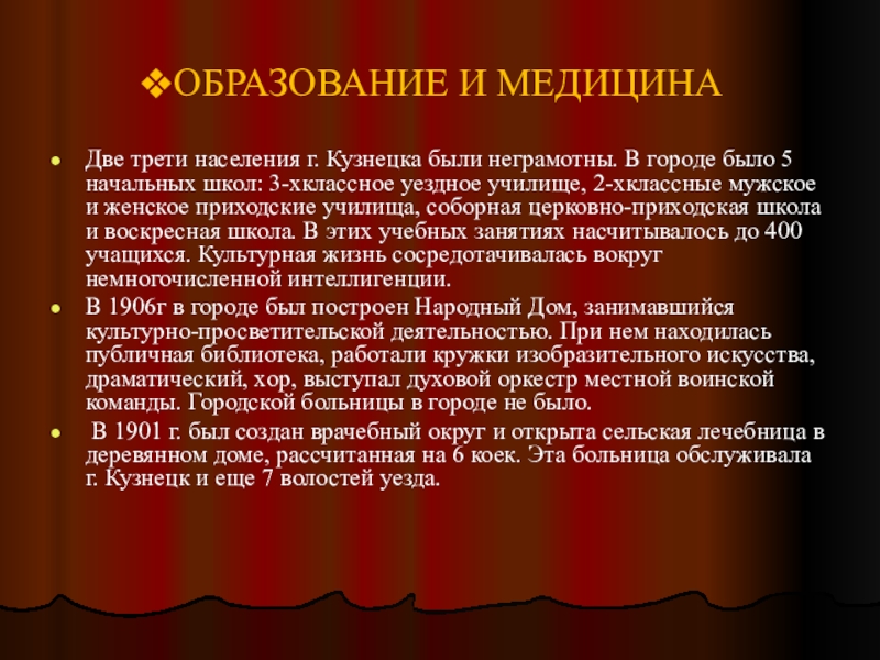 Две трети населения г. Кузнецка были неграмотны. В
