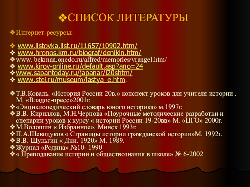 В.В. Кириллов, М.Н.Чернова «Поурочные методические разработки и сценарии уроков к курсу « истории России 19-20вв» М. «ЦГО» 2000г.