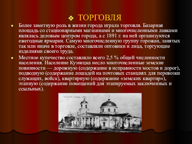 стационарными магазинами и многочисленными лавками являлась деловым центром города, а с 1891 г. на ней организуются ежегодные ярмарки. Самую многочисленную группу горожан, занятых так или иначе в торговле, составляли оптовики и лица, торгующие изделиями своего труда.