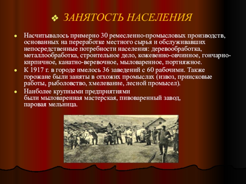 К 1917 г. в городе имелось 36 заведений с 60 рабочими. Также горожане были заняты в отхожих промыслах (извоз, приисковые работы, рыболовство, хмелевание, лесной промысел).