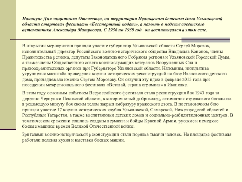 Накануне Дня защитника Отечества, на территории Ивановского детского дома Ульяновской области стартовал фестиваль «Бессмертный подвиг», в память о подвиге советского автоматчика Александра Матросова. С 1936 по 1939 год он воспитывался в этом селе.