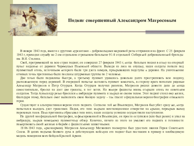 Историческая реконструкции была посвящена бою за деревню Чернушки Псковской области, который прошел в 1943 году. Тогда воспитанник Ивановского детского дома, юный автоматчик стрелкового батальона Александр Матросов героически погиб в бою.
