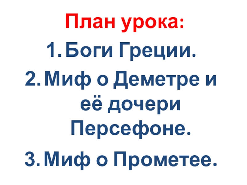 План урока:Боги Греции.Миф о Деметре и её дочери Персефоне.Миф о Прометее.