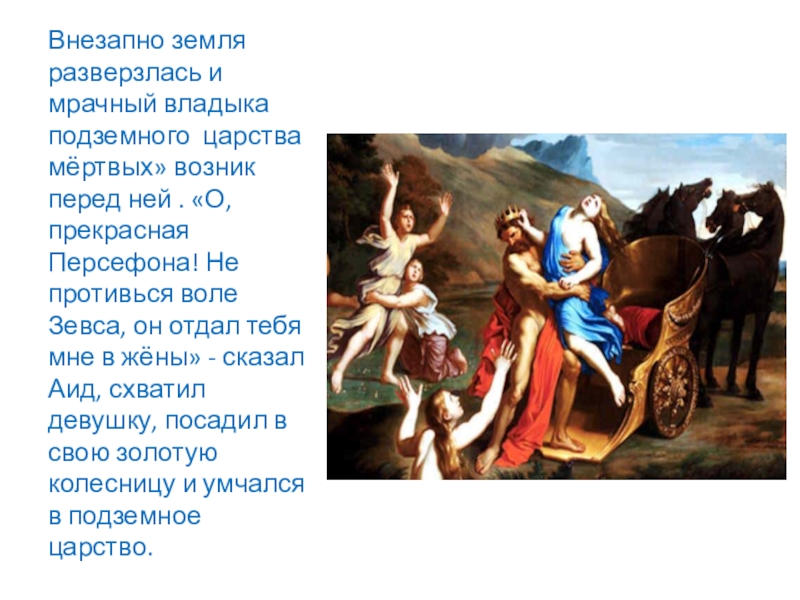 ней . «О, прекрасная Персефона! Не противься воле Зевса, он отдал тебя мне в жёны» - сказал Аид, схватил девушку, посадил в свою золотую колесницу и умчался в подземное царство.