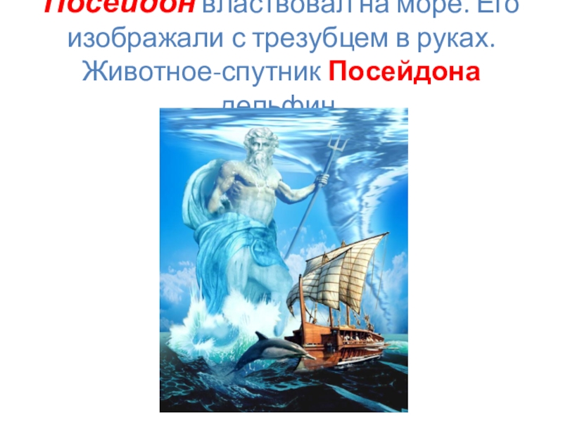 Слайд 5Посейдон властвовал на море. Его изображали с трезубцем в руках. Животное-спутник