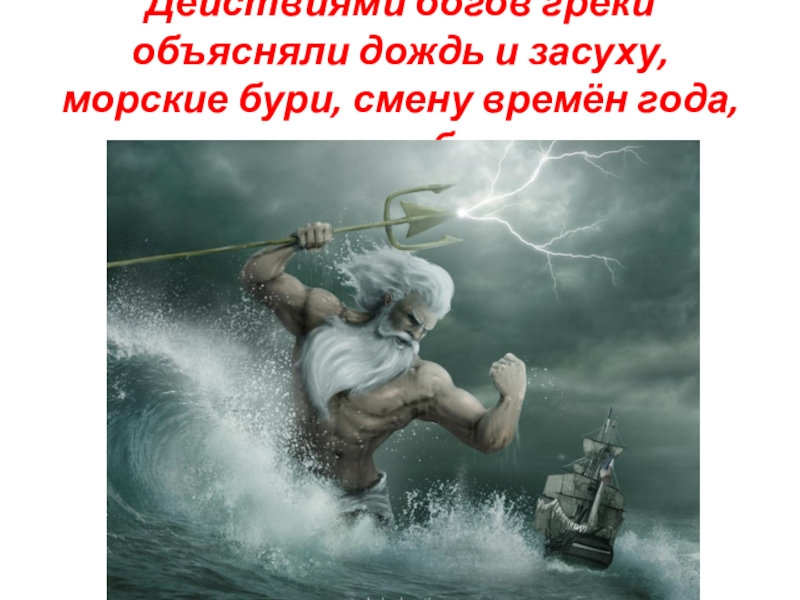 Слайд 8Действиями богов греки объясняли дождь и засуху, морские бури, смену времён