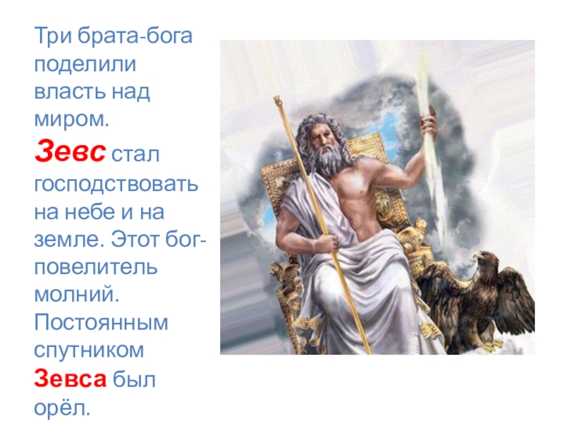 Слайд 4Три брата-бога поделили власть над миром. Зевс стал господствовать на небе и