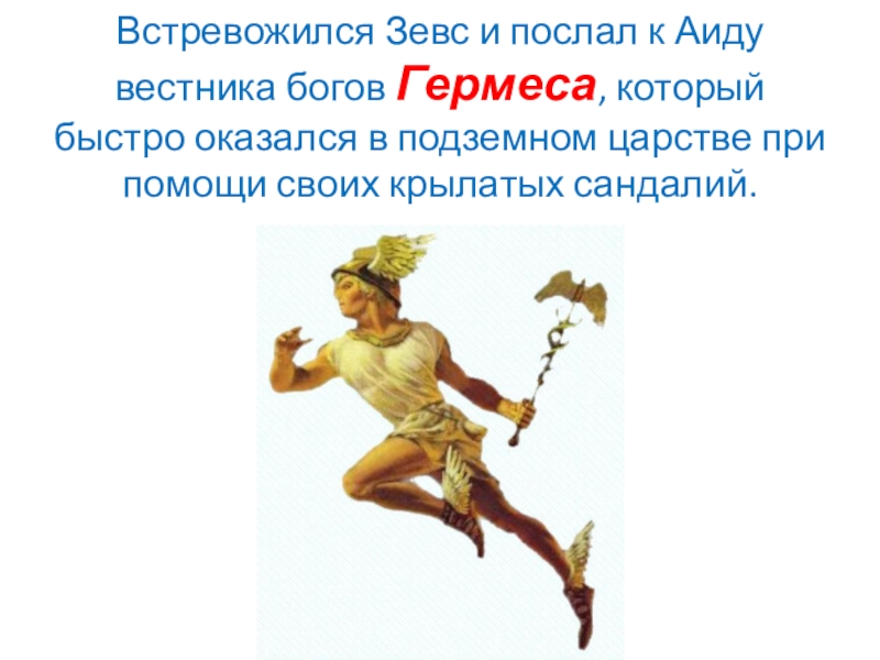 Слайд 19Встревожился Зевс и послал к Аиду вестника богов Гермеса, который быстро
