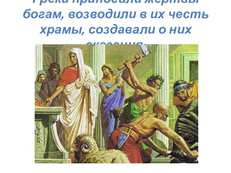 Слайд 14Греки приносили жертвы богам, возводили в их честь храмы, создавали о