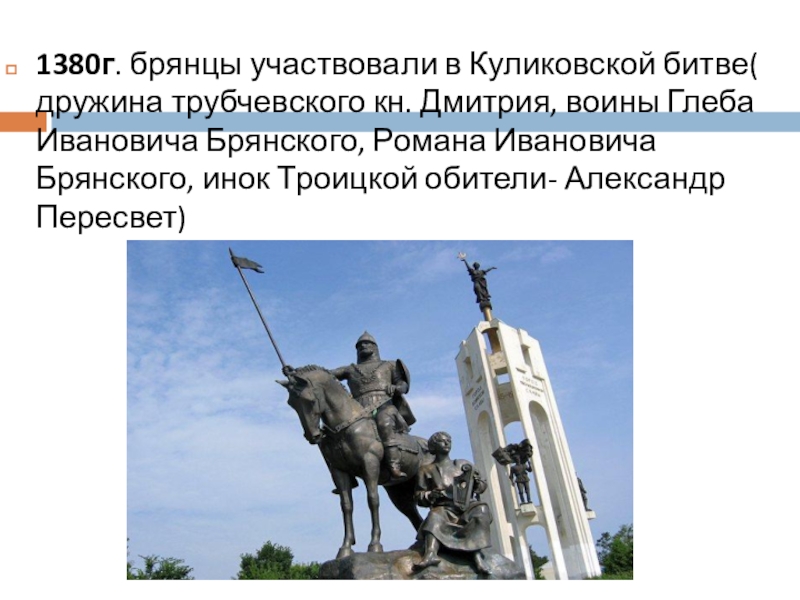 1380г. брянцы участвовали в Куликовской битве( дружина трубчевского кн. Дмитрия, воины
