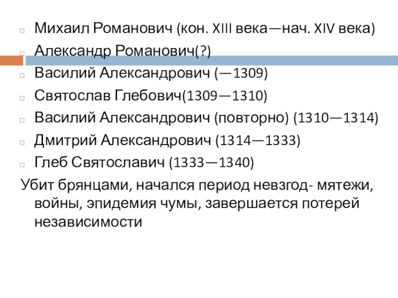 Убит брянцами, начался период невзгод- мятежи, войны, эпидемия чумы, завершается потерей независимости