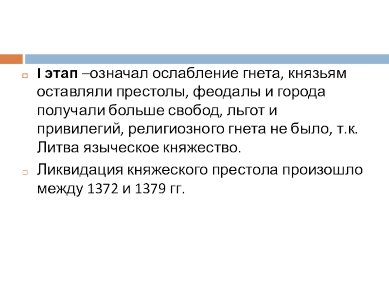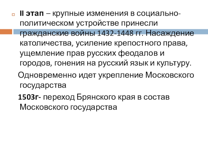 1432-1448 гг. Насаждение католичества, усиление крепостного права, ущемление прав русских феодалов и городов, гонения на русский язык и культуру.