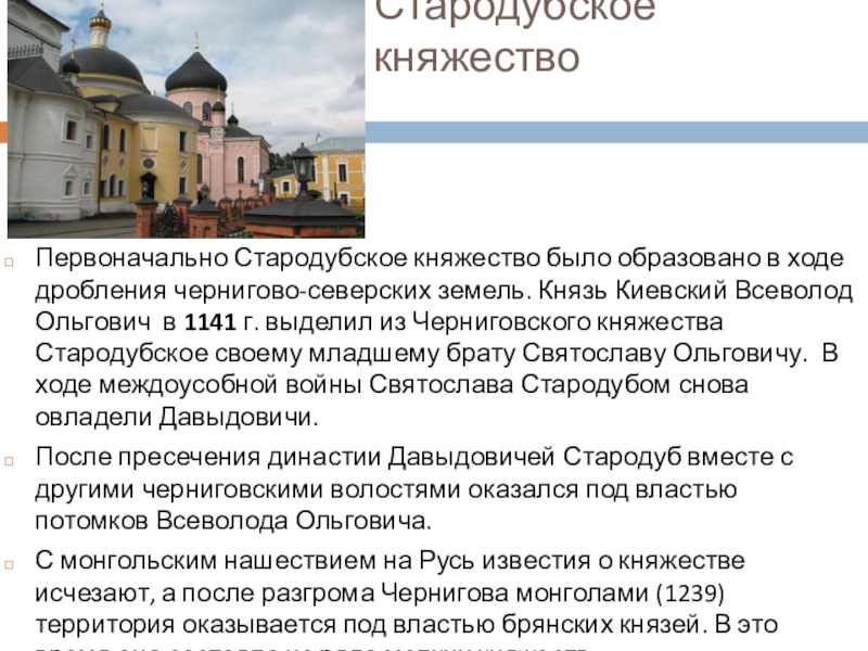 Первоначально Стародубское княжество было образовано в ходе дробления чернигово-северских земель.