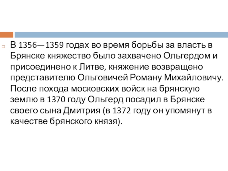 к Литве, княжение возвращено представителю Ольговичей Роману Михайловичу. После похода московских войск на брянскую землю в 1370 году Ольгерд посадил в Брянске своего сына Дмитрия (в 1372 году он упомянут в качестве брянского князя).