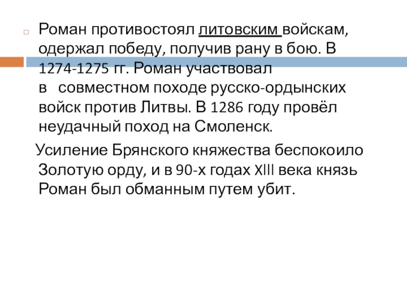 Усиление Брянского княжества беспокоило Золотую орду, и в 90-х годах Xlll века князь Роман был обманным путем убит.