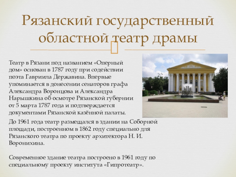 До 1961 года театр размещался в здании на Соборной площади, построенном в 1862 году специально для Рязанского театра по проекту архитектора Н. И. Воронихина.