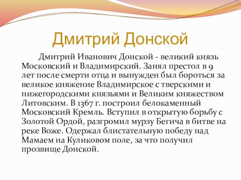 престол в 9 лет после смерти отца и вынужден был бороться за великое княжение Владимирское с тверскими и нижегородскими князьями и Великим княжеством Литовским. В 1367 г. построил белокаменный Московский Кремль. Вступил в открытую борьбу с Золотой Ордой, разгромил мурзу Бегича в битве на реке Воже. Одержал блистательную победу над Мамаем на Куликовом поле, за что получил прозвище Донской.