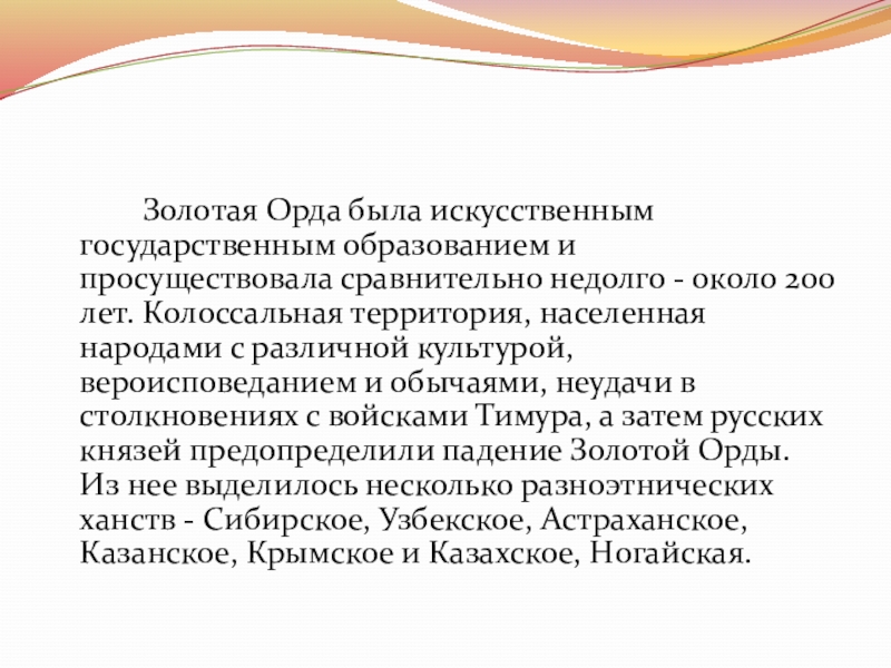 около 200 лет. Колоссальная территория, населенная народами с различной культурой, вероисповеданием и обычаями, неудачи в столкновениях с войсками Тимура, а затем русских князей предопределили падение Золотой Орды. Из нее выделилось несколько разноэтнических ханств - Сибирское, Узбекское, Астраханское, Казанское, Крымское и Казахское, Ногайская.
