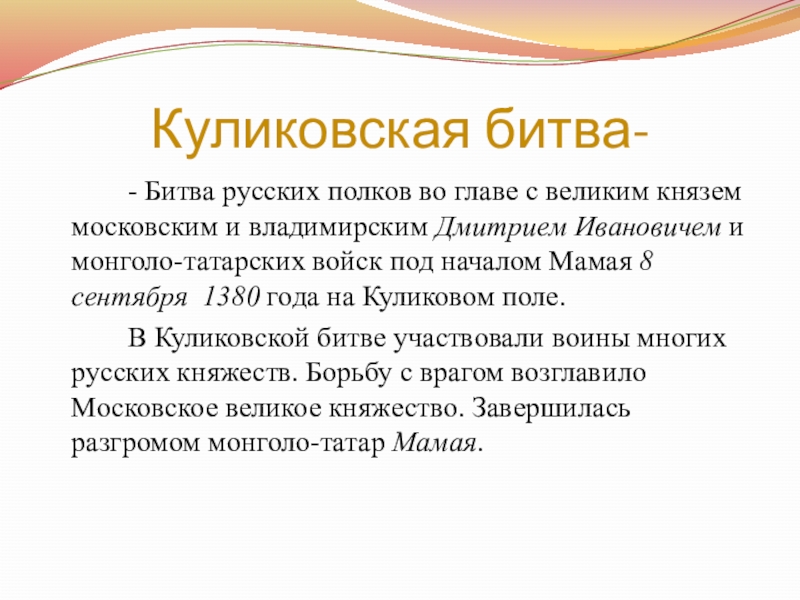 и владимирским Дмитрием Ивановичем и монголо-татарских войск под началом Мамая 8 сентября 1380 года на Куликовом поле.