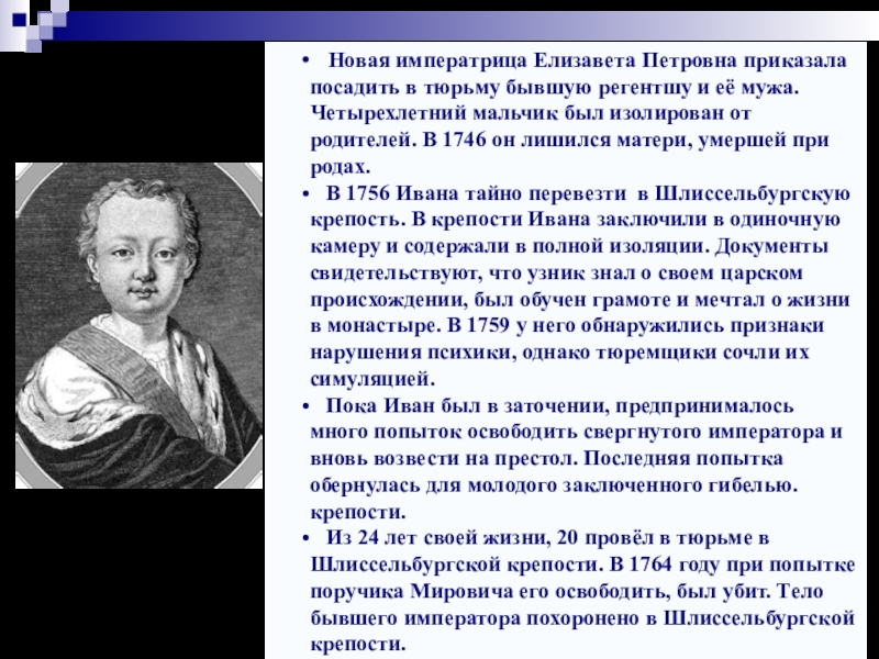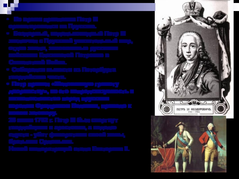 Но Петр был поклонником Пруссии. Елизавета разочаровалась в нем и после рождения Екатериной Павла решила передать престол именно ему.